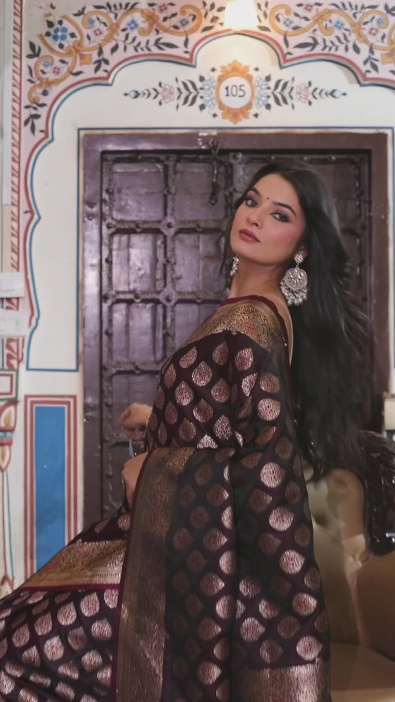 Step into timeless elegance with this royal golden zari woven jacquard Kanjivaram silk saree, crafted for women who love luxurious traditional fashion. The rich maroon-brown base paired with opulent golden zari work creates a majestic look that is ideal for weddings, festive celebrations, and grand occasions.