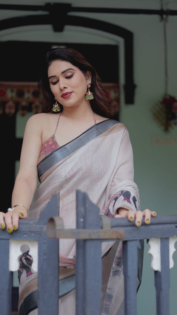 Elevate your everyday style with this beautifully crafted printed cotton linen saree, designed for women who love subtle elegance with artistic detailing. The saree features a soothing ivory base that feels light and airy, making it perfect for all-day comfort. The highlight lies in its thoughtfully illustrated elephant and tree motifs, inspired by traditional folk art, adding a unique cultural charm.