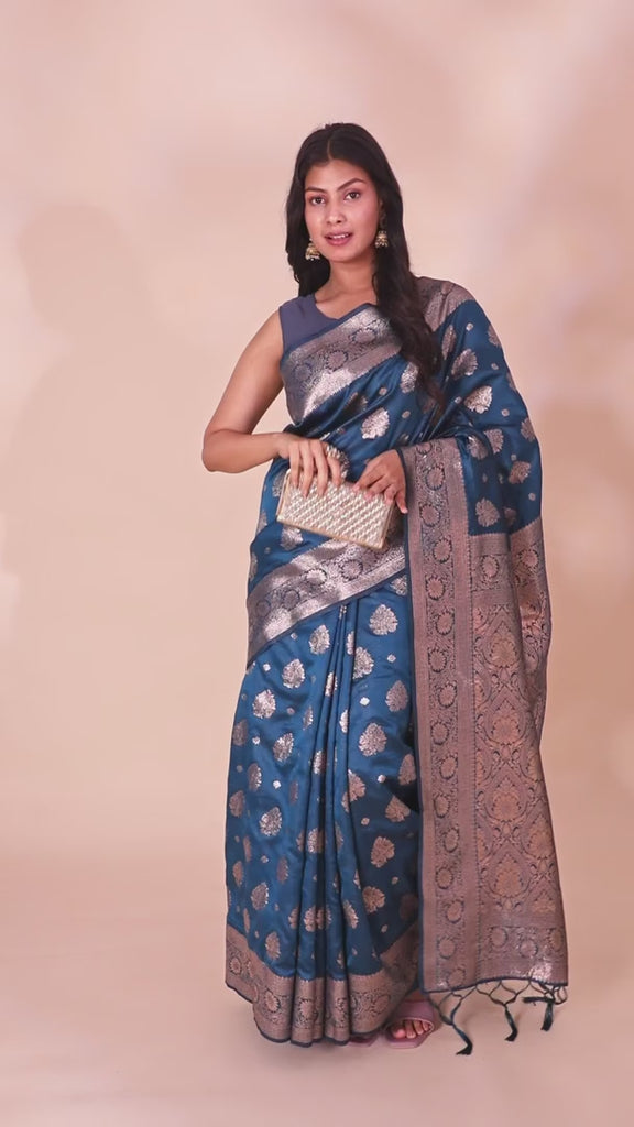 - This Banarasi silk saree beautifully blends traditional weaving with modern. elegance, making every drape look royal and unforgettable.
